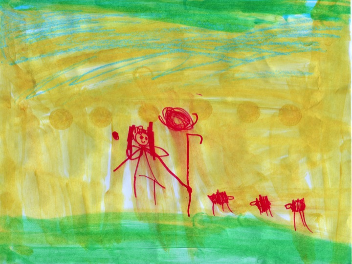 At the age of 4 Nadira drew a series of pictures depicting the birth of Jesus. This was a Selah moment, an art response to the story of the Shepherds watching over the sheep when the birth of Jesus was announced to them. The yellow skies represents the glow from the presence of the angels.